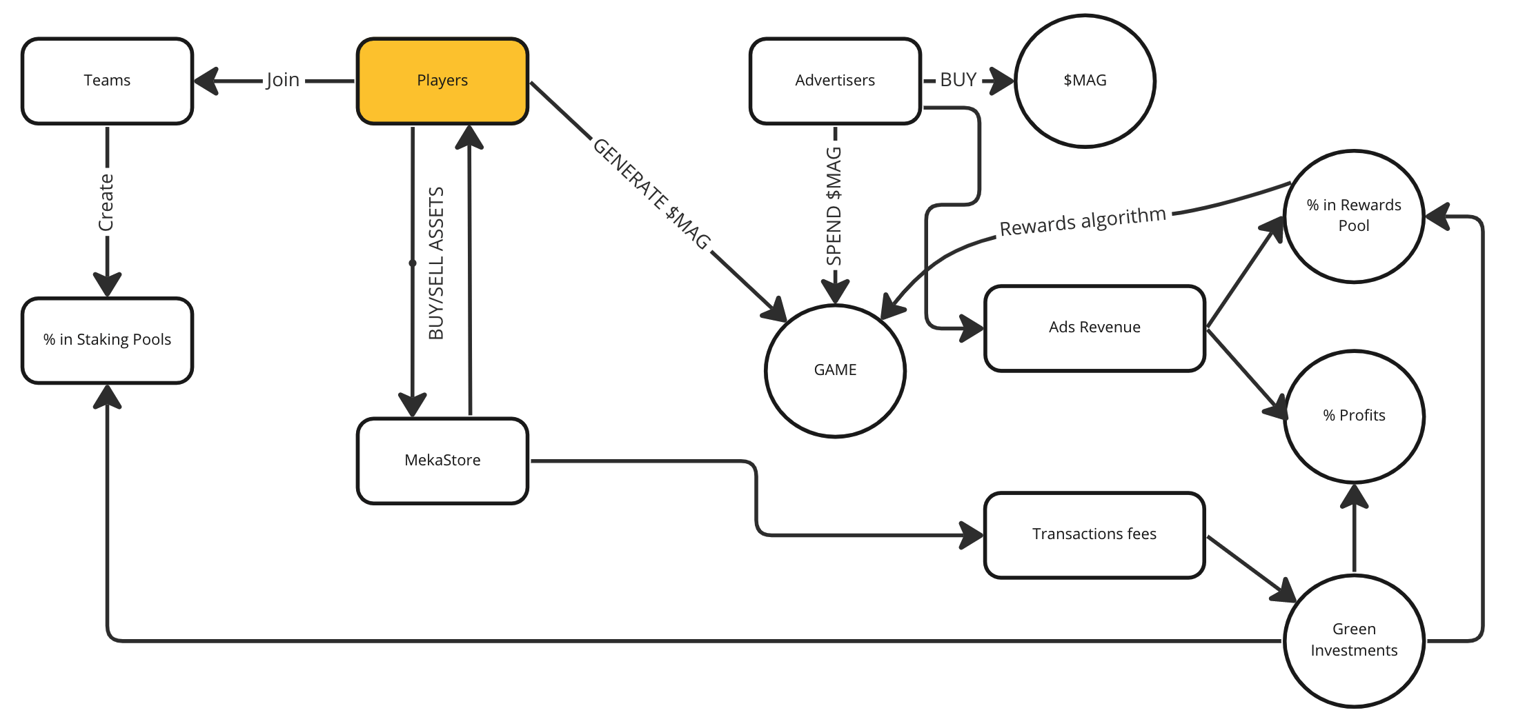 $MAG is intended to be spent in the ecosystem. For example, by purchasing vouchers (consumables) such as a Twitch gift card. 50% of advertising revenue is reinvested between the reward and the staking pools on a 50:50 basis at the beginning, to encourage active players. The distribution may change over time based on user game behavior and revenue generation.